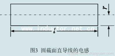 穿心電感的電感量一般都比較小,大約在幾微亨到幾十微亨之間,電感量大小與穿心電感中導線的大小以及長度,還有磁珠的截面積都有關系,但與磁珠電感量關系最大的還要算磁珠的相對導磁率 。圖3、圖4是分別是指導線和穿心電感的原理圖,計算穿心電感時,首先要計算一根圓截面直導線的電感,然后計算結果乘上磁珠相對導磁率 就可以求出穿心電感的電感量。